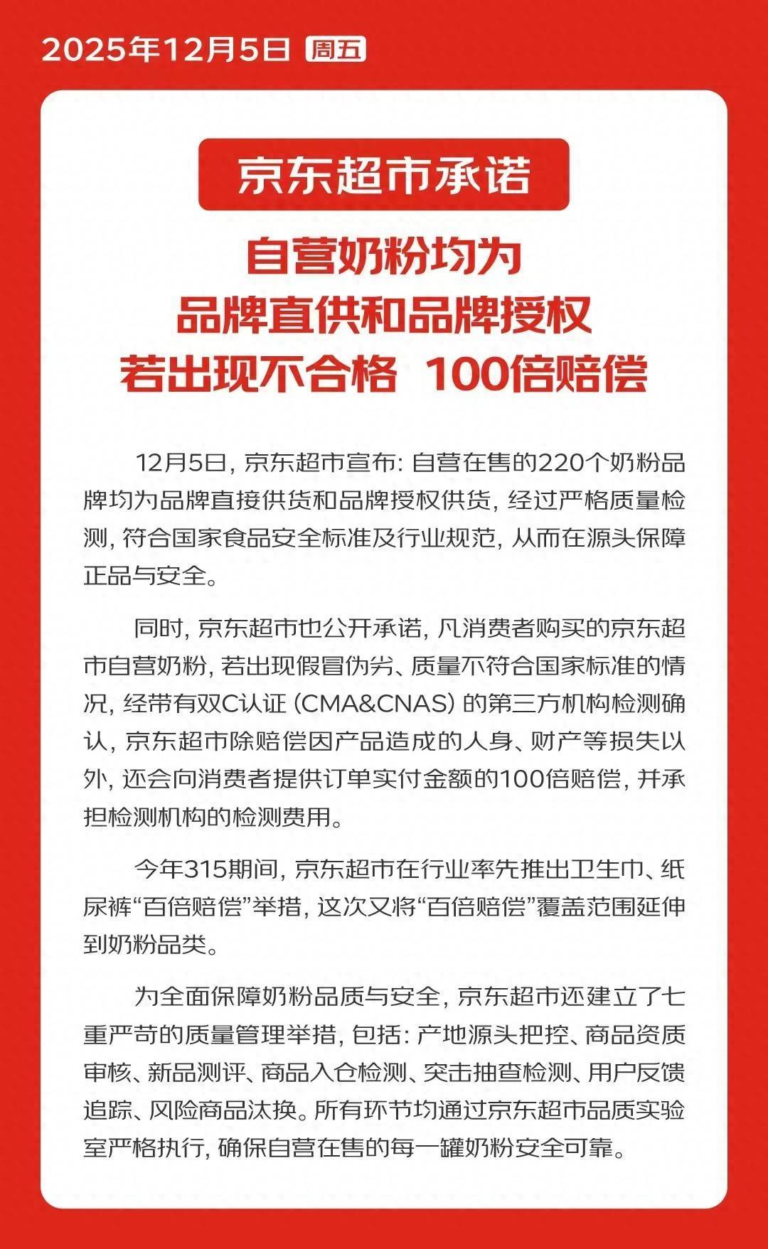 同时,京东超市也公开承诺,凡消费者购买的京东超市自营奶粉,若出现假冒伪劣、质量不符合国家标准的情况,经带有双C认证(CMA&CNAS)的第三方机构检测确认,京东超市除赔偿因产品造成的人身、财产等损失以外,还会向消费者提供订单实付金额的100倍赔偿,并承担检测机构的检测费用。